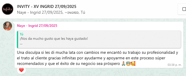 En Invity transformamos tus celebraciones en experiencias únicas a través de invitaciones web cautivadoras. Nos especializamos en crear diseños personalizados que harán que tu evento brille desde la primera vista, desde bellos Save the Date hasta QRs personalizados y confirmación de asistencia, adaptando cada detalle e información a los gustos de los festejados.
